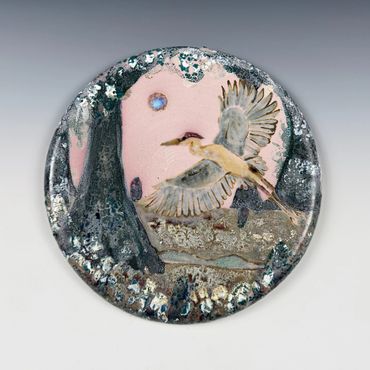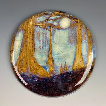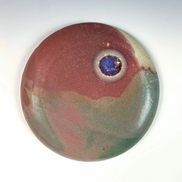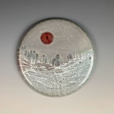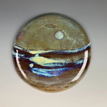 Amanda works primarily with clay and layered glazes, allowing heat, gravity, and chemistry to play an active role in the final composition. Many of her wall works are fired flat so fluxing glazes can flow, pool, and settle across the surface, creating luminous atmospheric effects that echo shifting horizons and celestial forms. Through years of experimentation with glaze chemistry and firing methods, she embraces both control and chance, allowing the kiln to become a collaborator in shaping each landscape.