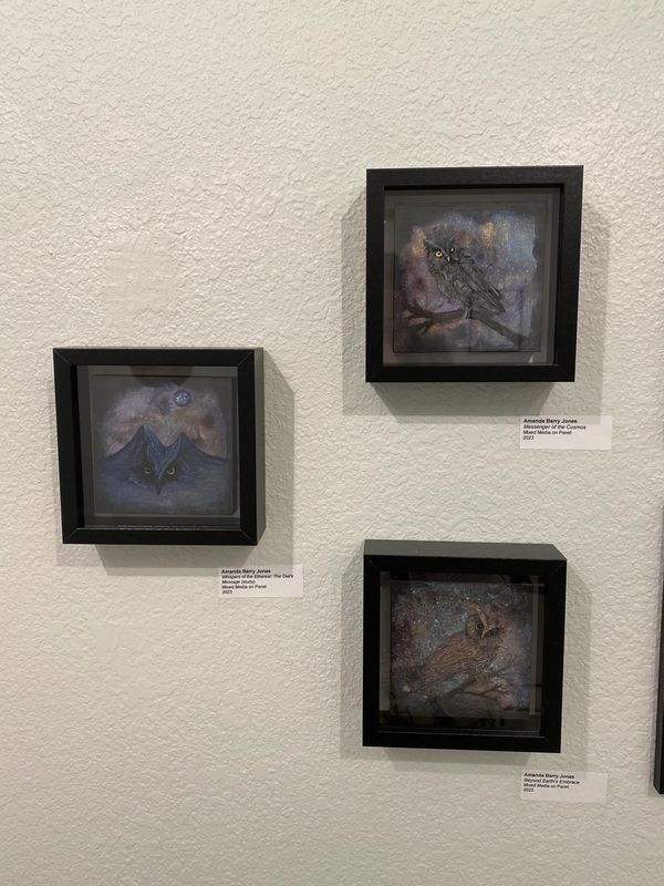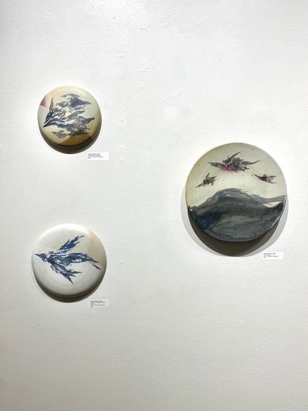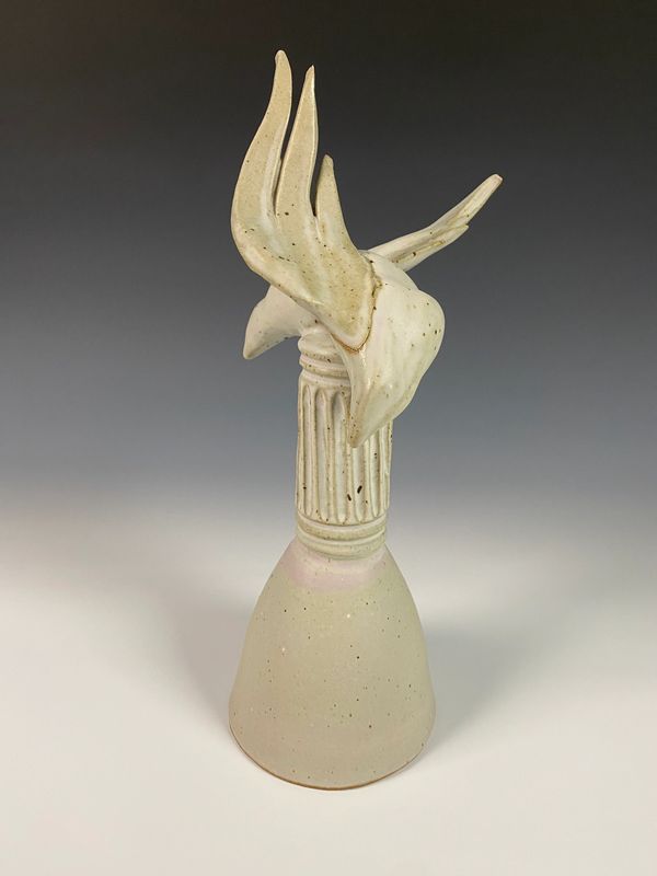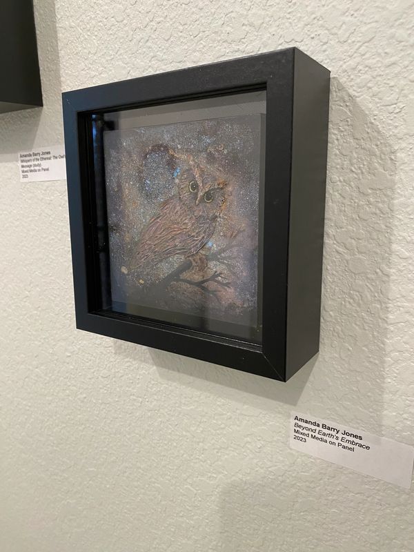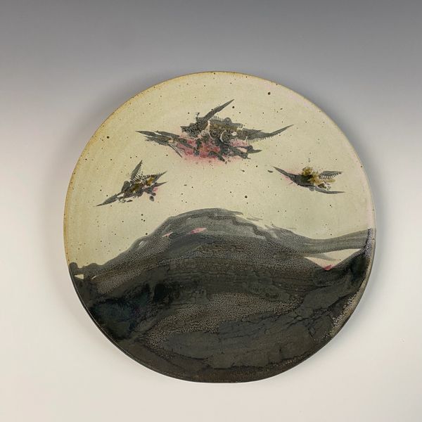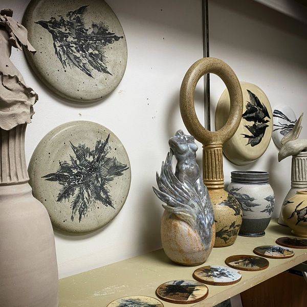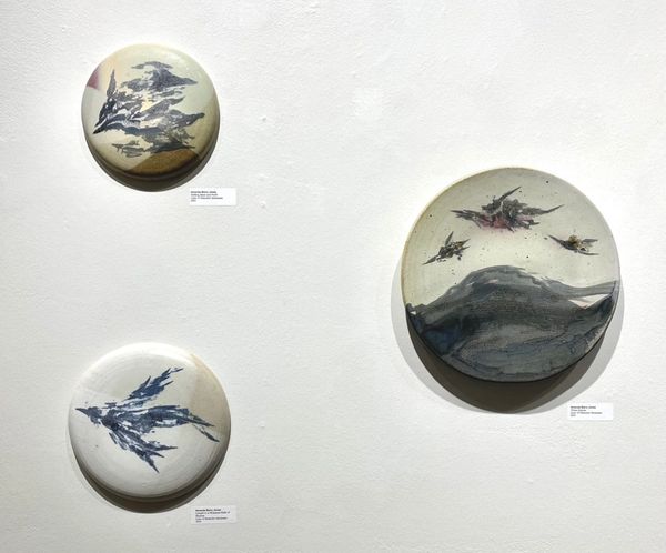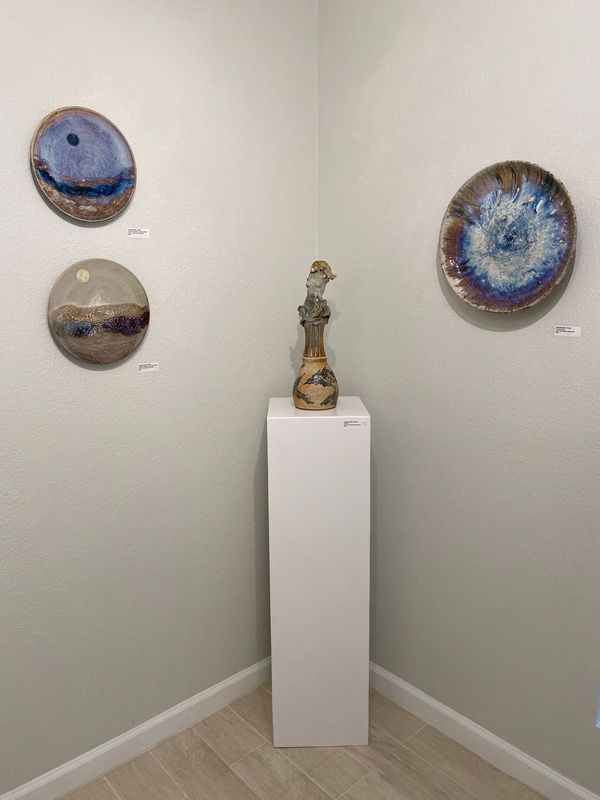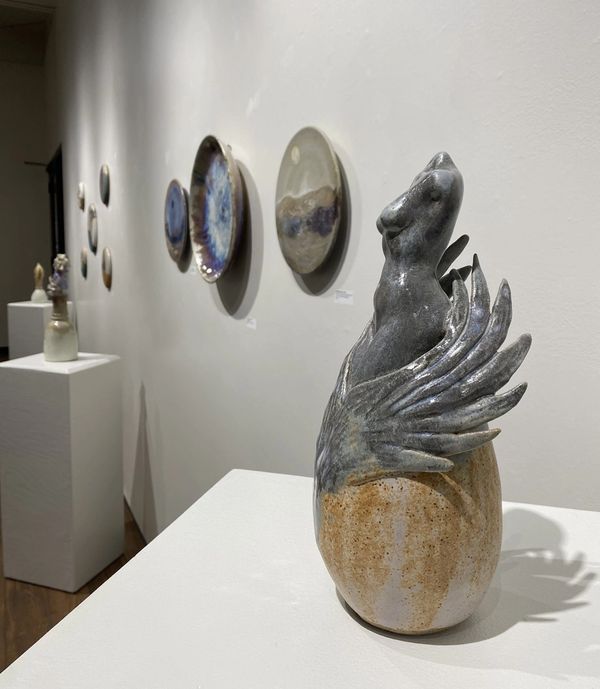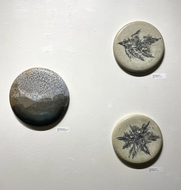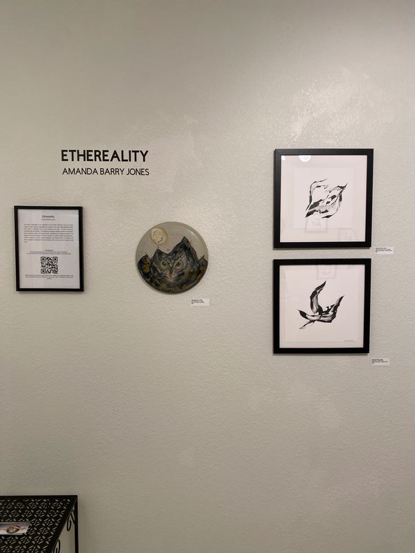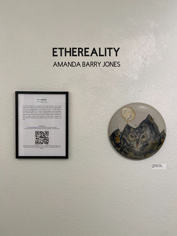 This series, Ethereality, is an exploration of the human experience and our cosmic existence. Each artwork encapsulates an essence of the spirit, often adopting birdlike forms, with a noticeable focus on the recurring owl motif - a symbol commonly associated with the afterlife. The expansive landscapes depicted compel contemplation about humanity's place in the vast universe, emphasizing the ephemeral nature of life against the cosmic backdrop. The use of ceramics, a material rooted in geological time, serves to preserve culture, convey messages, and shape identity. In essence, this series catalyzes introspection into the fleeting nature of time and our impact on this world.