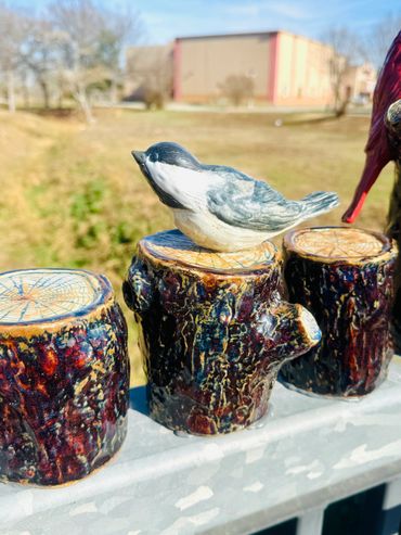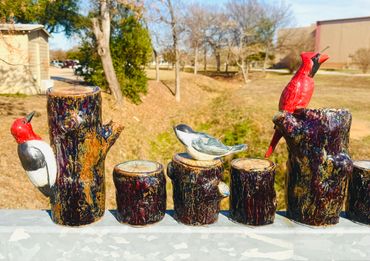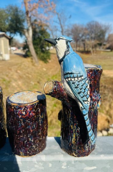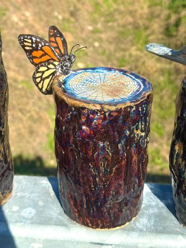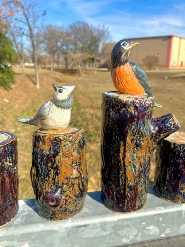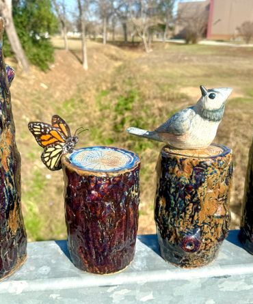 Amanda Barry Jones says, “The 2024 storms—the May derecho and Hurricane Beryl—left profound marks on our communities, especially hard-hit Garden Oaks where I live and the Greater Heights where I once lived. Uprooting ancient oaks and pines—which served as namesakes and guardians of our neighborhoods—the storms left landscapes littered with massive piles of wood and debris.” At first glance, “Nature Reclaims: Wood Pile” is reminiscent of these storms’ destructive aftermaths, however, a closer inspection reveals the magical transformation taking place within the unearthed root ball and nooks and crannies of the tree’s broken stump. Here, Barry Jones has crafted insects, reptiles, birds, and mammals, giving new life to the planet through the decaying wood; turning a symbol of destruction into a celebration of nature’s resilience and the beauty hidden within the chaos.